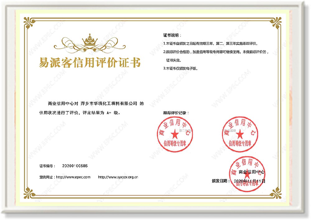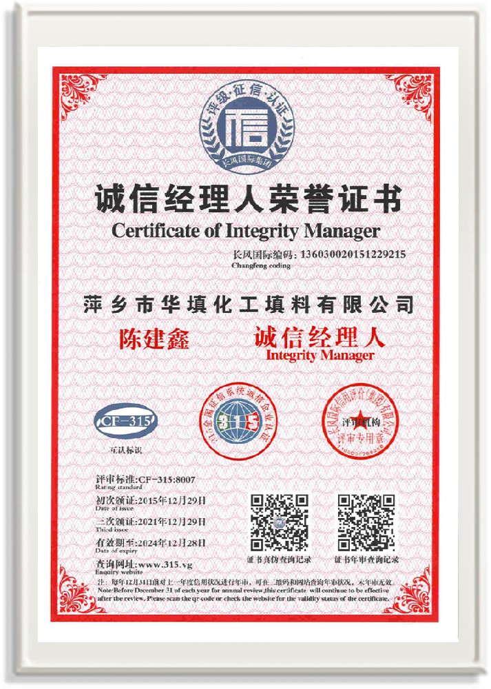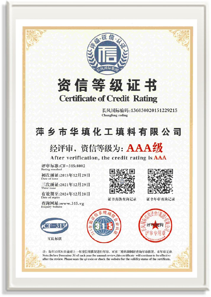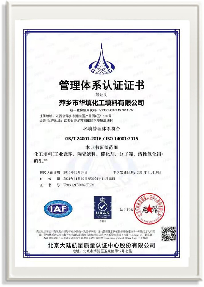 萍鄉(xiāng)市華填化工填料有限公司,位于320國道、109國道、浙贛鐵路、昌金高速公路貫穿其中,交通便利,是江西西部一顆燦爛明珠,創(chuàng)建于20世紀70年代初期,是中國石油天然氣股份有限公司“能源一號網(wǎng)”會員企業(yè)、中國石化物資采購電子商務(wù)網(wǎng)絡(luò)和中國海洋石油總公司采辦業(yè)務(wù)系統(tǒng)成員單位,是上海大學江西材料基因組工程產(chǎn)業(yè)研究院工業(yè)陶瓷產(chǎn)業(yè)創(chuàng)新聯(lián)盟基地,且通過ISO9001:2015質(zhì)量管理體系、ISO14001:2015環(huán)境管理體系、ISO45001:2018職業(yè)健康安全管理體系認證的化工填料生產(chǎn)企業(yè)。公司擁有陶瓷、塑料、金屬填料、催化劑、活性氧化鋁、分子篩等產(chǎn)品生產(chǎn)線,現(xiàn)有固定資產(chǎn)3616萬元,占地面積3.8萬平方米。公司具有悠久的生產(chǎn)歷史、雄厚的技術(shù)力量和先進的生產(chǎn)工藝設(shè)備,可生產(chǎn)工業(yè)瓷球(支撐劑)、陶瓷、金屬、塑料質(zhì)的規(guī)整、散堆化工填料及分子篩、催化劑、生化濾料、活性氧化鋁、石化助劑、活性炭、環(huán)保材料、耐火材料等系列的200多種規(guī)格型號產(chǎn)品。